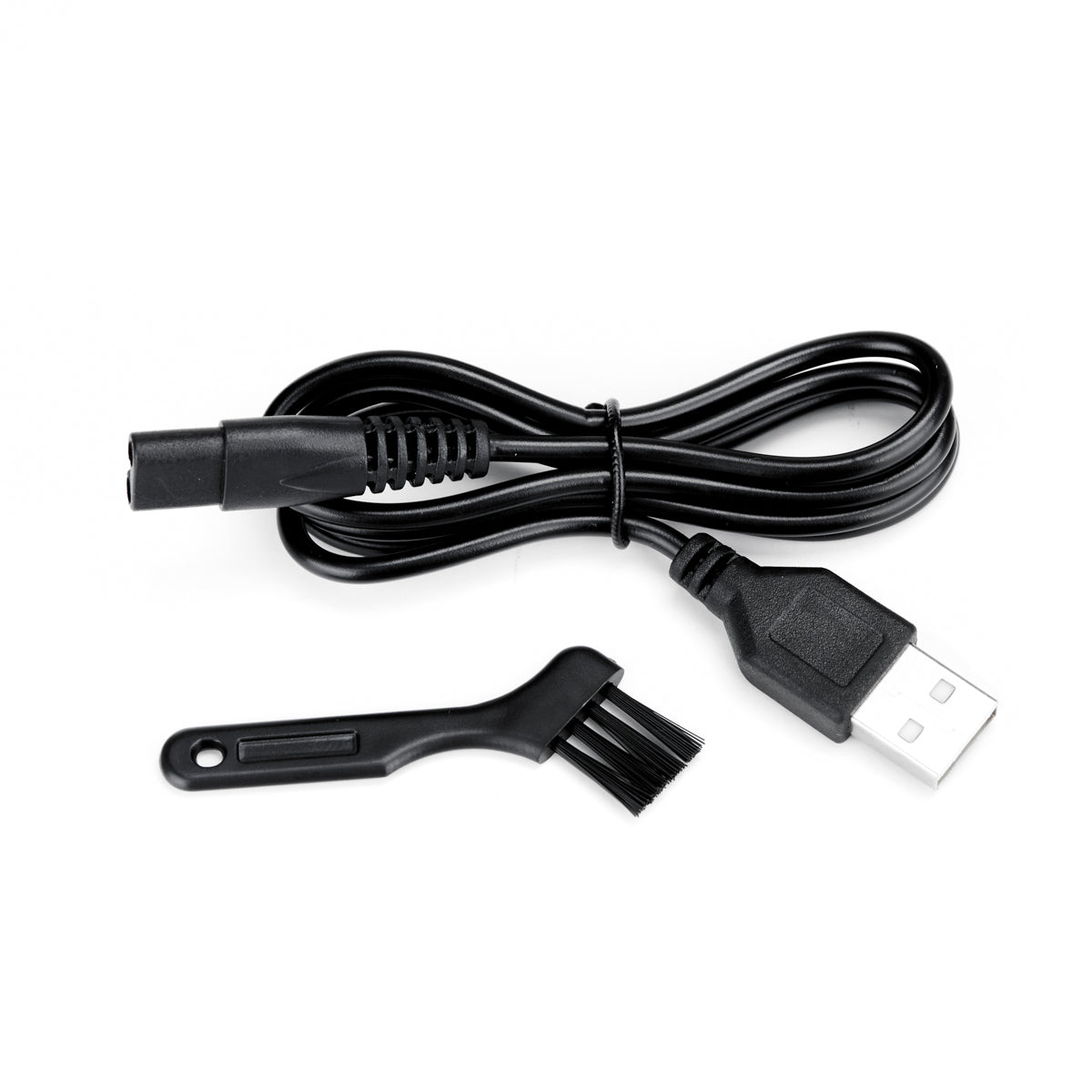 Box contents: razor, plastic protective cap for the head, brush for cleaning the head, USB charging cable, instructions.