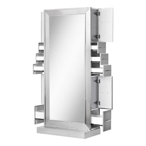 Modern hairdressing console with large mirror and practical drawers and cupboards on both sides. First class placement. An elegant and at the same time universal element of the interior that emphasizes the character of any hairdressing salon.