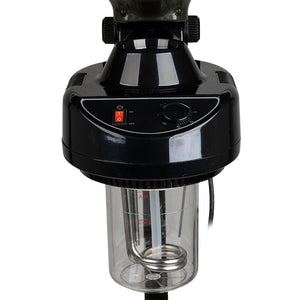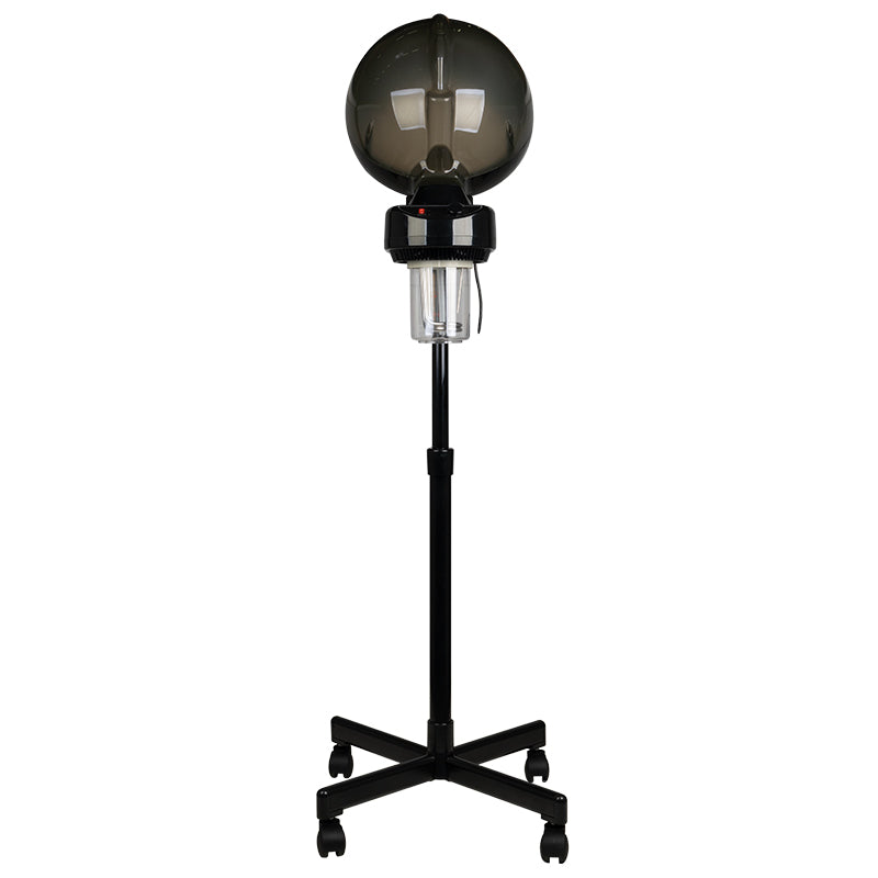 A hairdresser's sauna cap with a tripod shortens the duration of chemical treatments and supports the effect of care products.