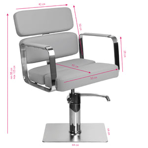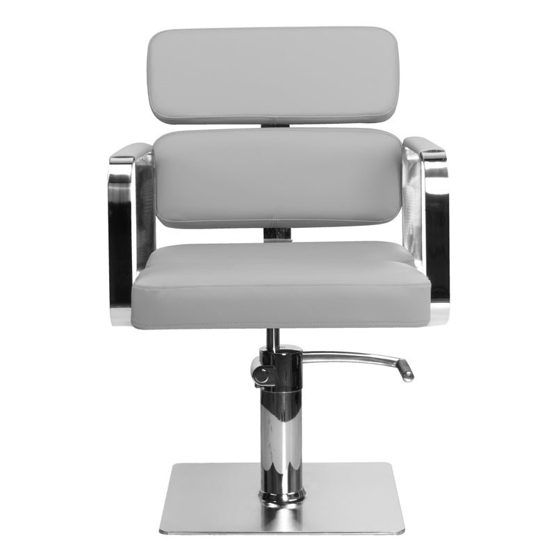 A modern hairdressing chair with a unique design. A very comfortable piece of furniture ideal for modern salons. . It has been specially shaped to ensure a comfortable position for the customer during treatment. It has adjustable height. It is stable and solid. The upholstery is made from high-quality eco-leather. Color gray