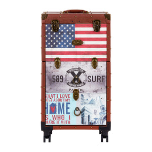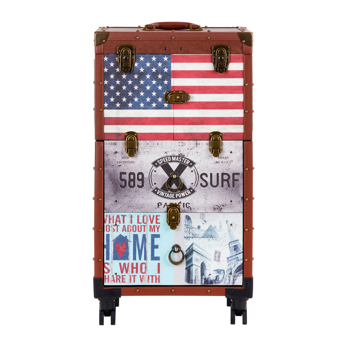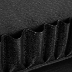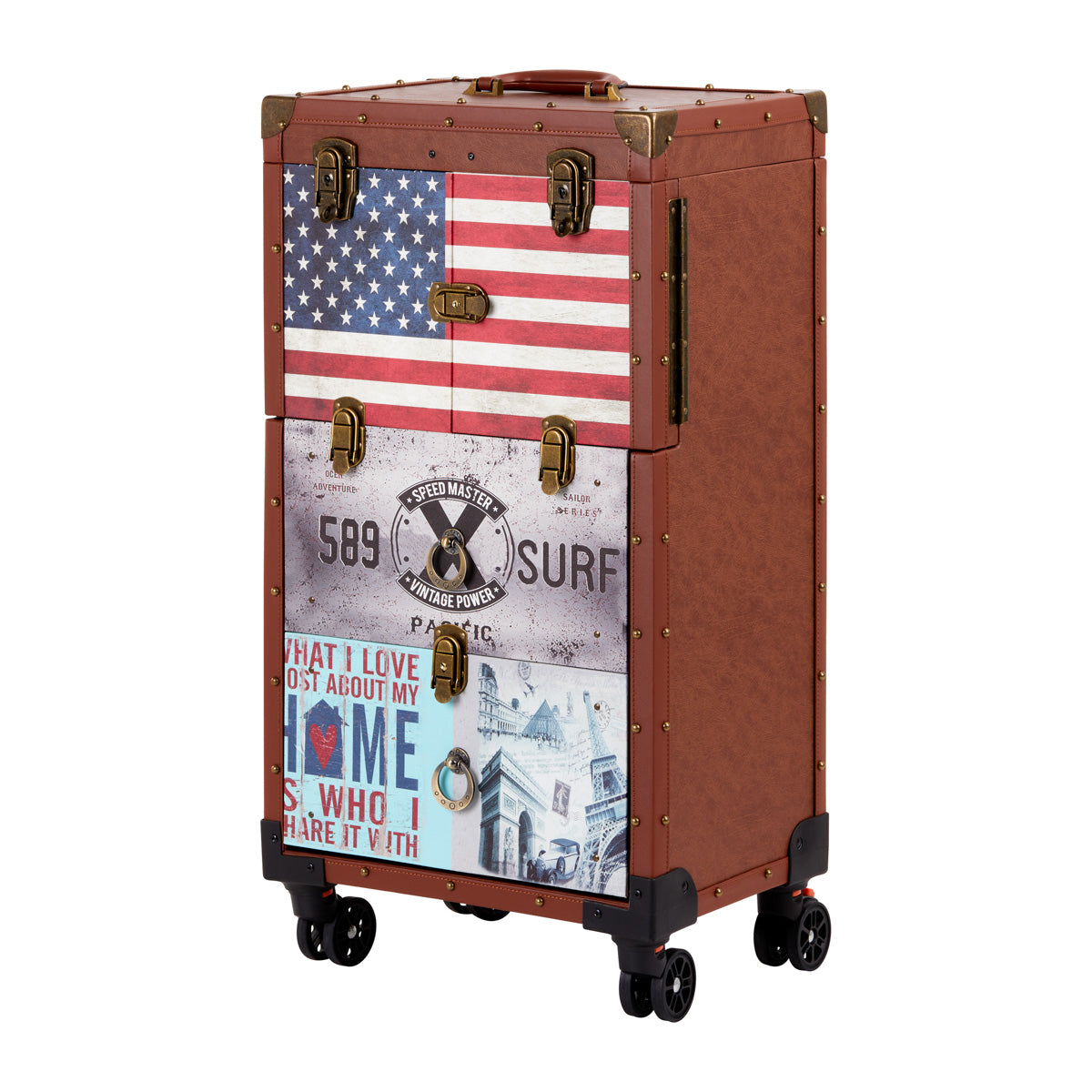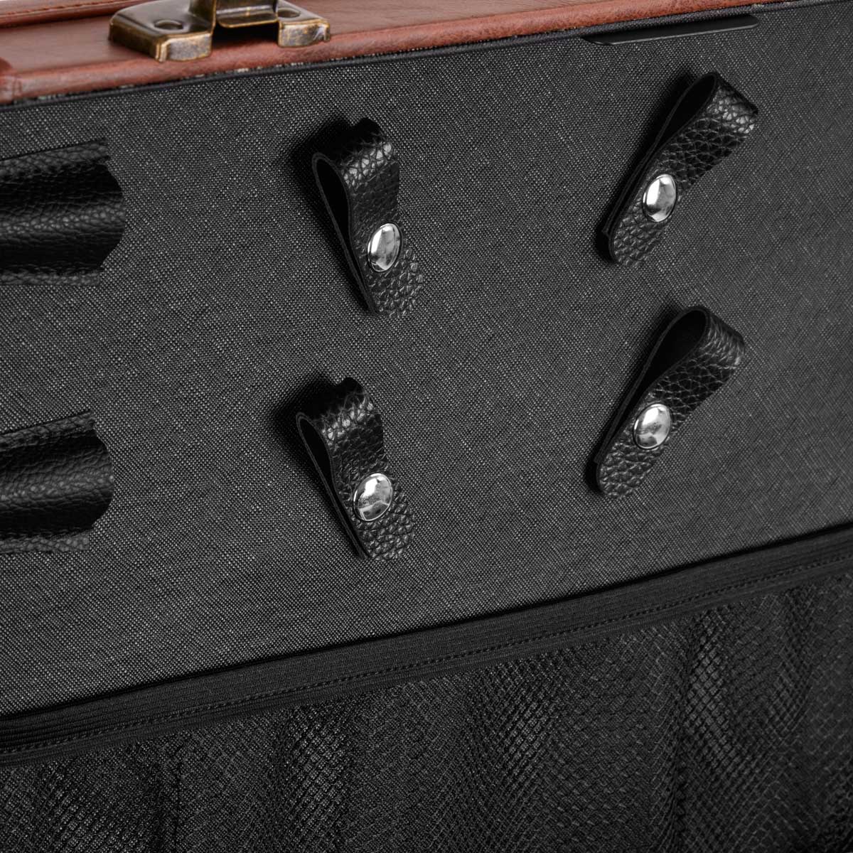The distinctive design of the Gabbiano C12 helper is the perfect solution for hair salons that value the unique appearance and elegant details . The fronts of the cabinets are decorated with stylized American patterns , which will certainly emphasize the atmosphere of the interior. Material imitating leather in brown tones and metal elements give the furniture elegance, masculine character and luxurious look . This helper is a good choice for people who value both interesting design and functionality .