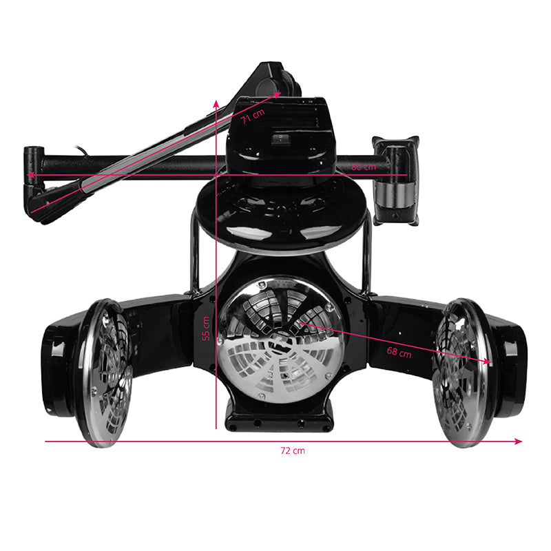 A dryer hood is a device used to speed up chemical and conditioning hair treatments. The infrared hood is a device that shortens the time of perming, lightening and coloring hair or simply applying a mask, thereby the mask is absorbed into the hair faster and better. The device significantly reduces the duration of treatments, saving time for the hairdresser and the customer. The electronic parameter setting makes work easier for the hairdresser.