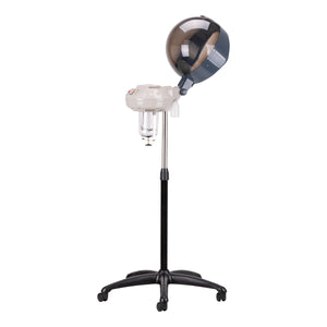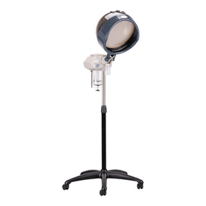 A hairdresser's sauna cap with a tripod shortens the duration of chemical treatments and supports the effect of care products.