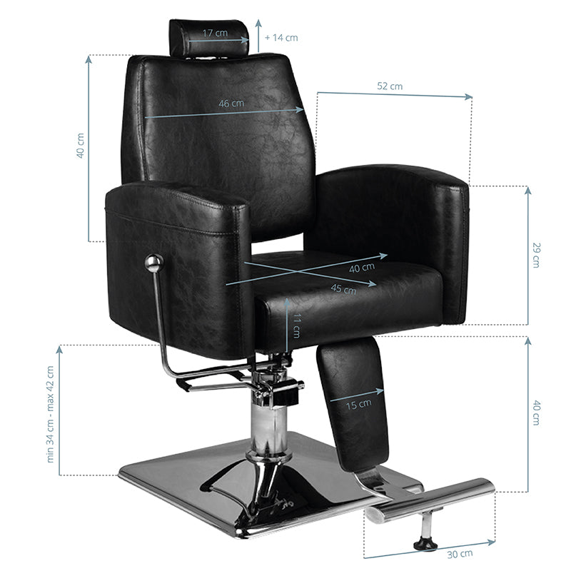 A classic hairdressing chair / barber chair from HAIR SYSTEM. Elegant and very comfortable. The solid chrome-plated frame ensures the stability of the seat. The upholstery was made from high-quality eco-leather in black. It has a backrest and headrest adjustment as well as an adjustable height (top-bottom).