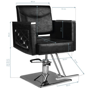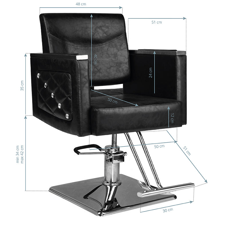 A modern hairdressing chair from HAIR SYSTEM. Elegant and very comfortable. The solid chrome-plated frame ensures the stability of the seat. The upholstery was made from high-quality eco-leather in black. It has adjustable height (top-bottom).