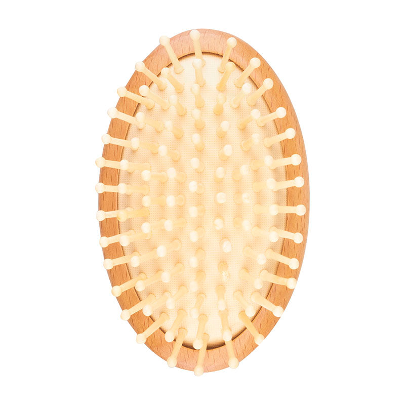 This wooden hairbrush is equipped with wooden needles that have rounded ends and are arranged on a rubber cushion. The rubber cushion with its hole allows the brush to work properly while combing. It has antistatic properties - the hair does not become electrified when combed.