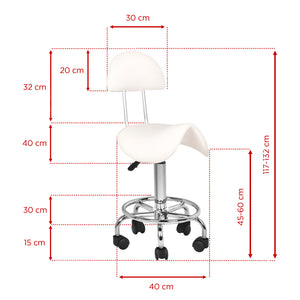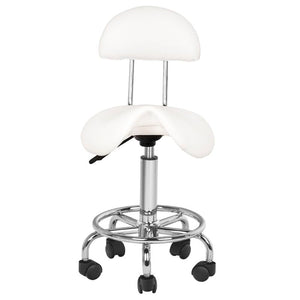 A comfortable, sturdy cosmetic stool with a backrest and a well-shaped seat features a 5-arm frame and plastic wheels. It is available in white. It is an essential piece of furniture in the beauty salon.