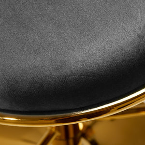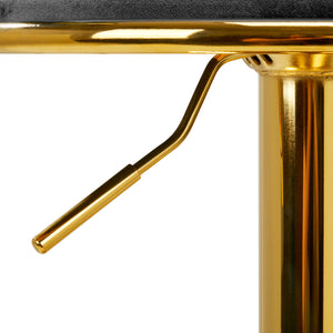 Agradable al tacto, el tapizado de terciopelo en tonos grises confiere al taburete un carácter único y el tejido estético del respaldo subraya el aspecto único del mueble. El acabado hace que los muebles llamen la atención. La montura en tonos dorados aporta elegancia y prestigio y armoniza perfectamente con el terciopelo.