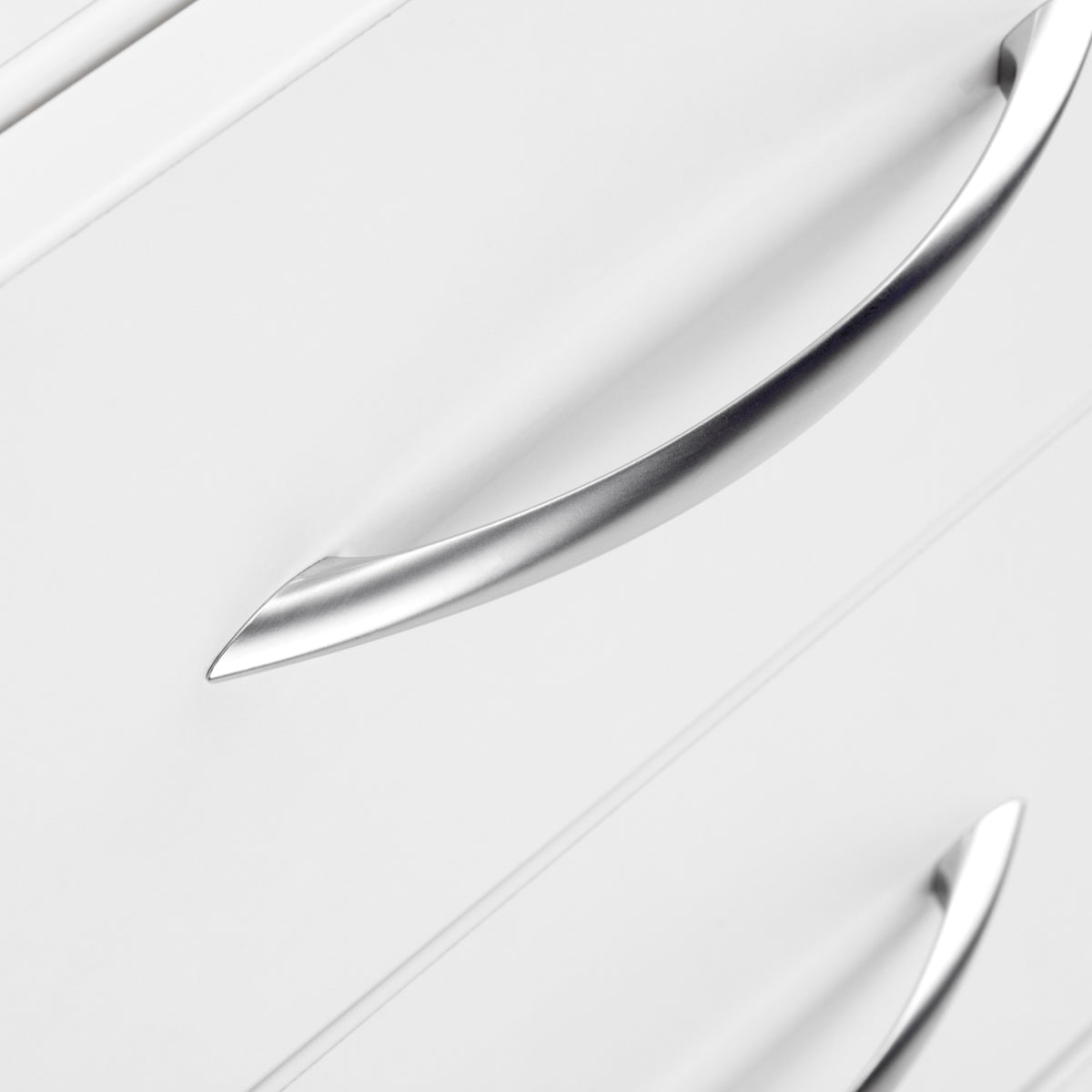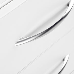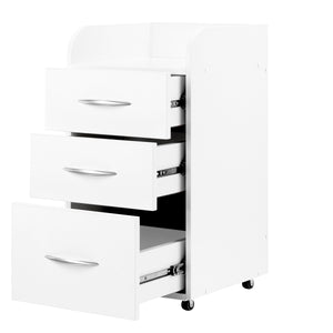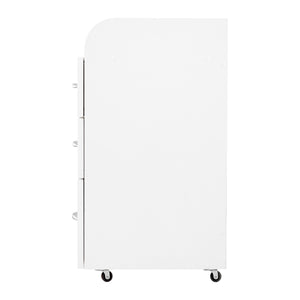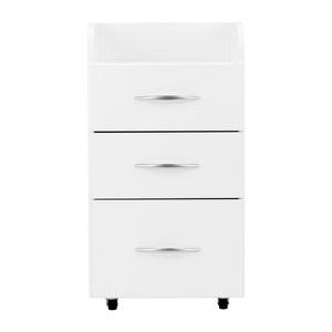 Un carro lateral tiene 3 cajones con guías. Color blanco. El carro lateral está equipado con ruedas, lo que facilita su desplazamiento.