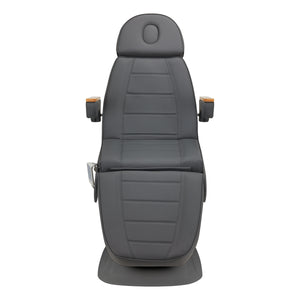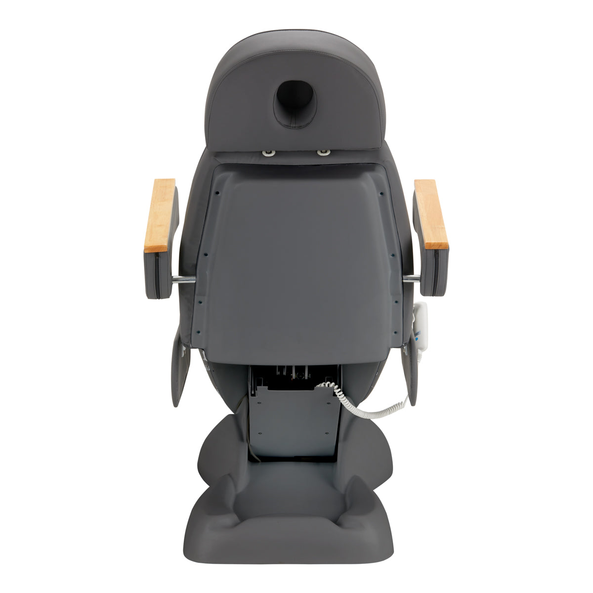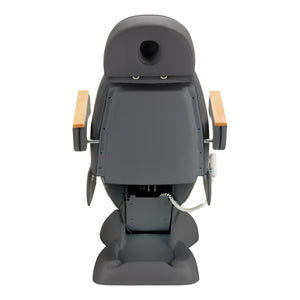 El sillón está relleno de espuma de la dureza adecuada y revestido con una piel sintética agradable al tacto en tonos grises. Gracias al uso de un material fácil de limpiar y resistente a desinfectantes seleccionados, el dispositivo es cómodo de usar , resistente a la humedad y fácil de limpiar. Una base sólida hecha de material duradero en tonos de gris garantiza estabilidad durante los tratamientos. Los elementos decorativos de madera en los reposabrazos distinguen la silla de otros modelos y añaden un toque elegante y visualmente atractivo . Los dobladillos correctamente contorneados dan a la silla un aspecto elegante y hacen que el asiento sea ergonómico.