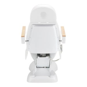 El sillón está relleno de espuma de la dureza adecuada y revestido con una piel sintética agradable al tacto en tonos blancos. Gracias al uso de un material fácil de limpiar y resistente a desinfectantes seleccionados, el dispositivo es cómodo de usar , resistente a la humedad y fácil de limpiar. Una base sólida hecha de material duradero en tonos blancos garantiza estabilidad durante los tratamientos. Los elementos decorativos de madera en los reposabrazos distinguen la silla de otros modelos y añaden un toque elegante y visualmente atractivo . Los dobladillos correctamente contorneados dan a la silla un aspecto elegante y hacen que el asiento sea ergonómico.