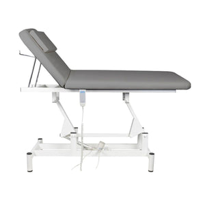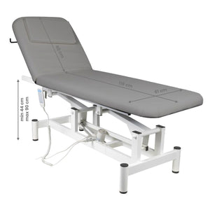 Esta tumbona es especialmente adecuada para tratamientos de fisioterapia y salones de belleza. Está equipado con un motor. De este modo, la altura se regula eléctricamente. La inclinación es ajustable manualmente. El reposacabezas tiene un recorte facial. La tumbona tiene una construcción extremadamente estable y una cómoda superficie de trabajo.