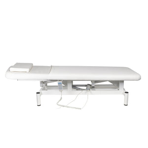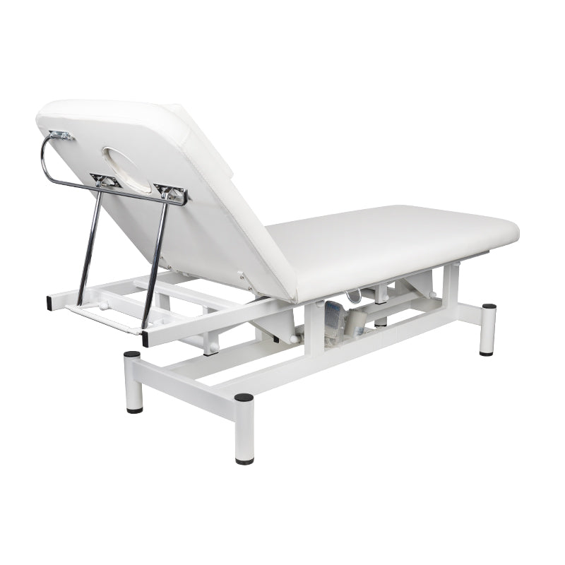 Esta tumbona es especialmente adecuada para tratamientos de fisioterapia y salones de belleza. Está equipado con un motor. De este modo, la altura se regula eléctricamente. La inclinación es ajustable manualmente. El reposacabezas tiene un recorte facial. La tumbona tiene una construcción extremadamente estable y una cómoda superficie de trabajo.