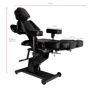 La tumbona es muy avanzada y se puede ajustar en muchos niveles (altura y respaldo ajustables con el interruptor de pie). La tumbona ofrece opciones de ajuste ilimitadas tanto para el artista como para el cliente.
