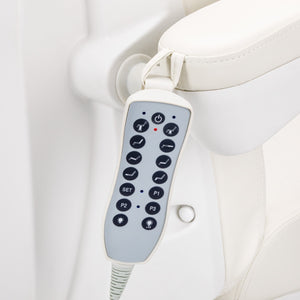 Los reposabrazos son móviles , se pueden colocar en posición vertical o girar 180º y son fácilmente desmontables, facilitando el acceso directo al cliente. Al final se encuentra un asa en la que se puede colgar fácilmente el mando a distancia.