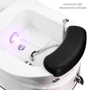 El sillón para el cuidado de los pies tiene una función de masaje de espalda y la posibilidad de controlar electrónicamente el asiento (ajustando la distancia entre el asiento y el pediluvio) y el respaldo según sea necesario. El pediluvio está equipado con un reposapiés que se puede adaptar individualmente a las necesidades del cliente.