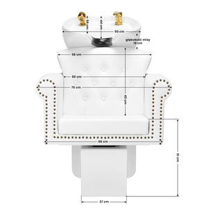 Una silla con el perfil adecuado y rellena de espuma duradera proporciona un soporte adecuado y, por tanto , una gran comodidad de uso . Los reposabrazos permiten posicionar correctamente los hombros del cliente . La agradable funda de piel sintética en tonos blancos garantiza una larga durabilidad y una fácil limpieza . El aspecto original y elegante del túnel de lavado con pespuntes decorativos y elementos dorados confiere al interior una expresión única. Se incluyen accesorios completos de color dorado , que incluyen un grifo, una ducha de mano y mangueras especiales para proporcionar un juego completo de herramientas para el trabajo .