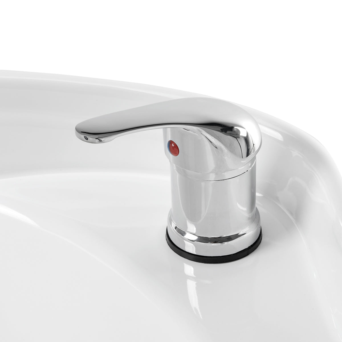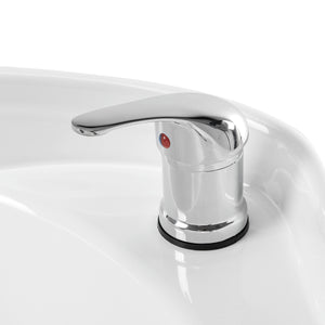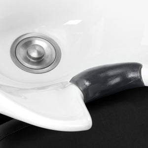 El estético lavabo cerámico en tonos blancos tiene la profundidad adecuada, gracias a lo cual evita salpicaduras excesivas de agua o productos especiales utilizados durante los tratamientos. Esto permite prestar una amplia gama de servicios de forma libre y eficiente . El material de alta calidad utilizado hace que el fregadero sea duradero, resistente a la decoloración y a los rayones y muy fácil de limpiar . El ángulo de inclinación del cuenco se puede ajustar para adaptarlo fácilmente a las necesidades individuales. Un cuello debidamente perfilado y un respaldo inclinado brindan apoyo y comodidad al lavar el cabello, y gracias al cómodo soporte de plástico en tonos negros, el cliente no sentirá ningún inconveniente asociado con el frío de la superficie cerámica.