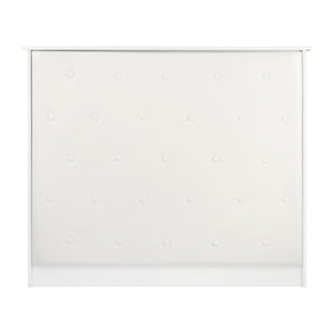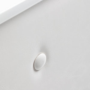 Este mueble está hecho de tablero laminado duradero y de alta calidad en tonos blancos, y las superficies lisas no causan problemas para mantener la limpieza ; si está sucia, simplemente límpiela con un paño húmedo. La parte frontal decorativa está revestida con polipiel en tonos blancos, lo que le aporta un estilo elegante , asegura la durabilidad del mueble y su fácil limpieza. Los botones decorativos añaden elegancia y singularidad adicionales y subrayan el carácter del interior. La recepción ha sido cuidadosamente fabricada, es estable y los materiales utilizados permiten un uso eficaz durante muchos años .