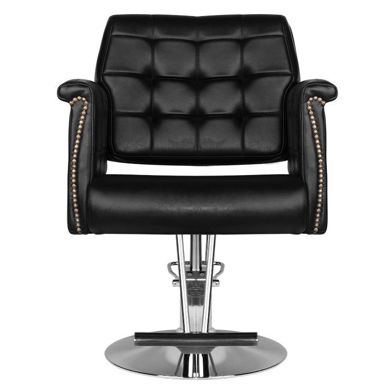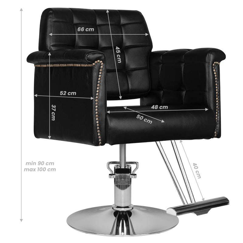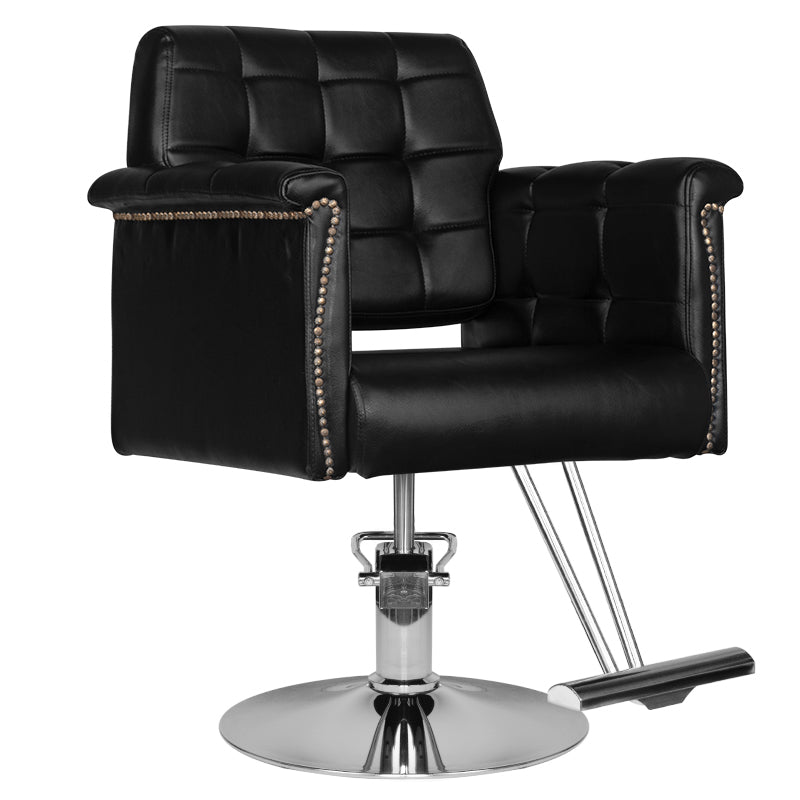 Un sillón de peluquería moderno de HAIR SYSTEM. Elegante y muy cómoda. La sólida estructura cromada garantiza la estabilidad del asiento. La tapicería era de cuero ecológico de alta calidad en color negro. Tiene altura regulable (arriba-abajo).