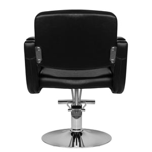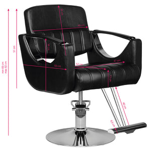 Un sillón de peluquería moderno de HAIR SYSTEM. Elegante y muy cómoda. La sólida estructura cromada garantiza la estabilidad del asiento. La tapicería era de cuero ecológico de alta calidad en color negro. Tiene altura regulable (arriba-abajo).