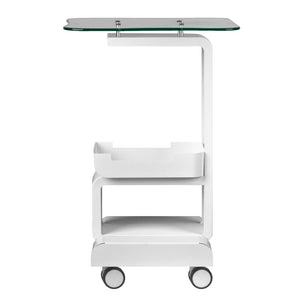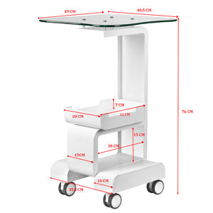 Un carrito cosmético funcional de metal y vidrio con ruedas de goma y función de bloqueo. Es ideal como mesa para equipamiento cosmético. Tiene estantes resistentes para dispositivos y accesorios cosméticos, así como ruedas para un movimiento suave. El mueble garantiza el confort de trabajo. Dimensiones: