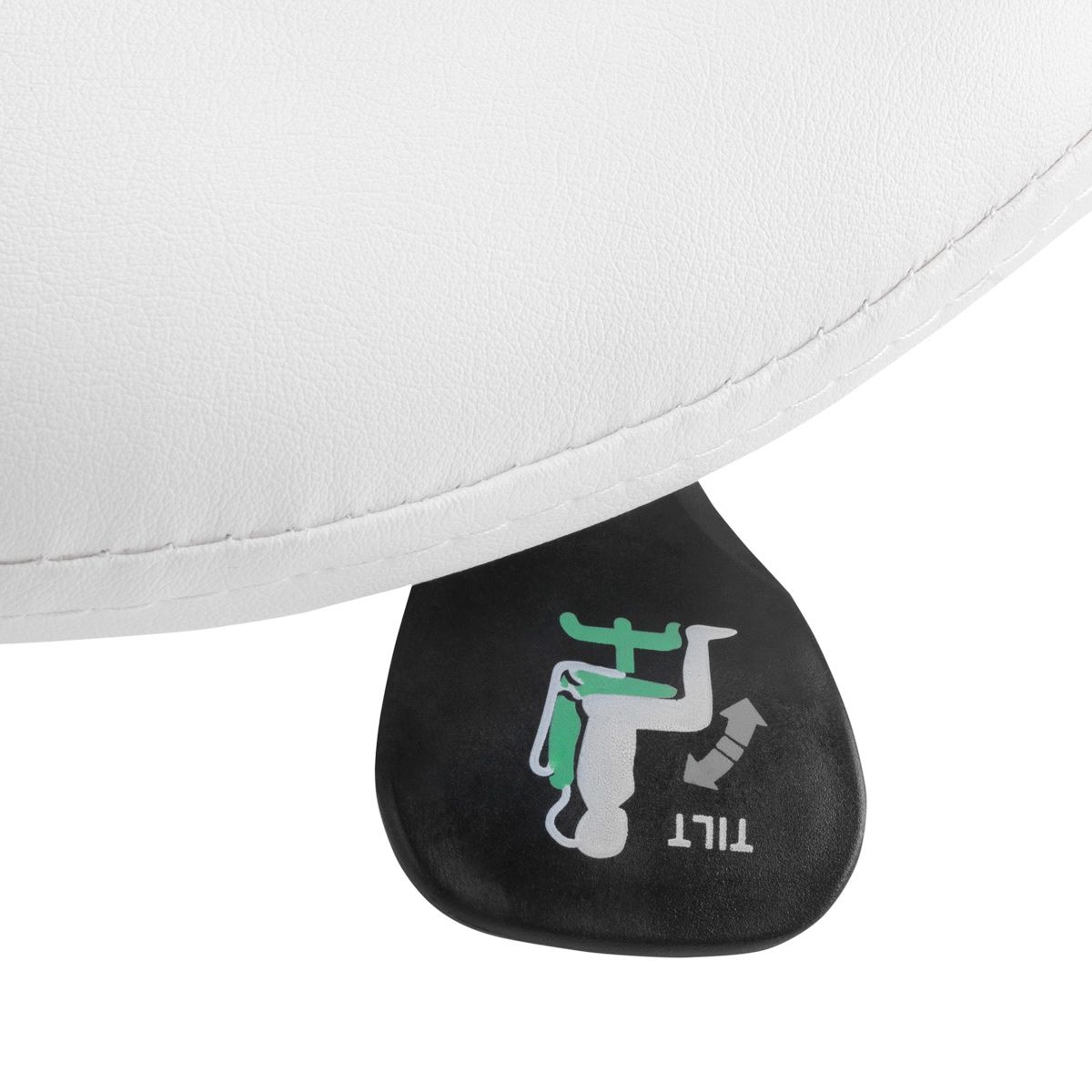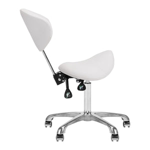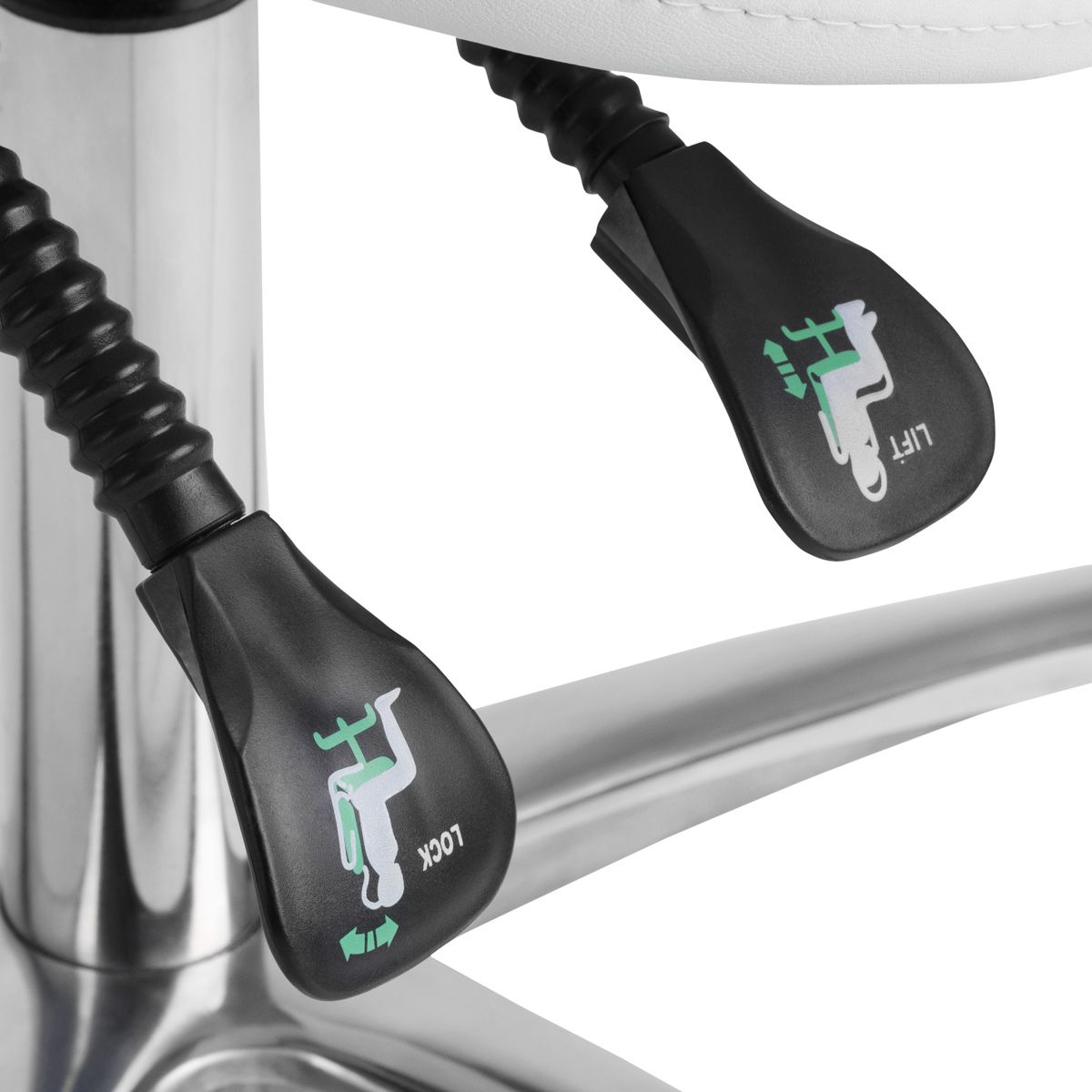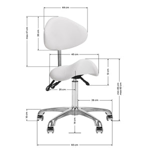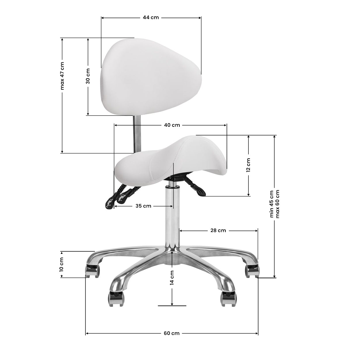 Taburete cosmético cómodo, exclusivo y estable con respaldo y asiento perfilado, sobre una base de cinco radios muy estable. Ajustable en tres niveles: