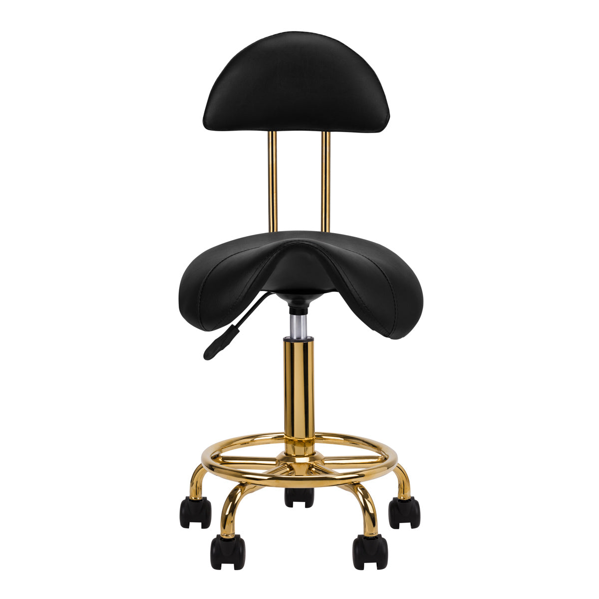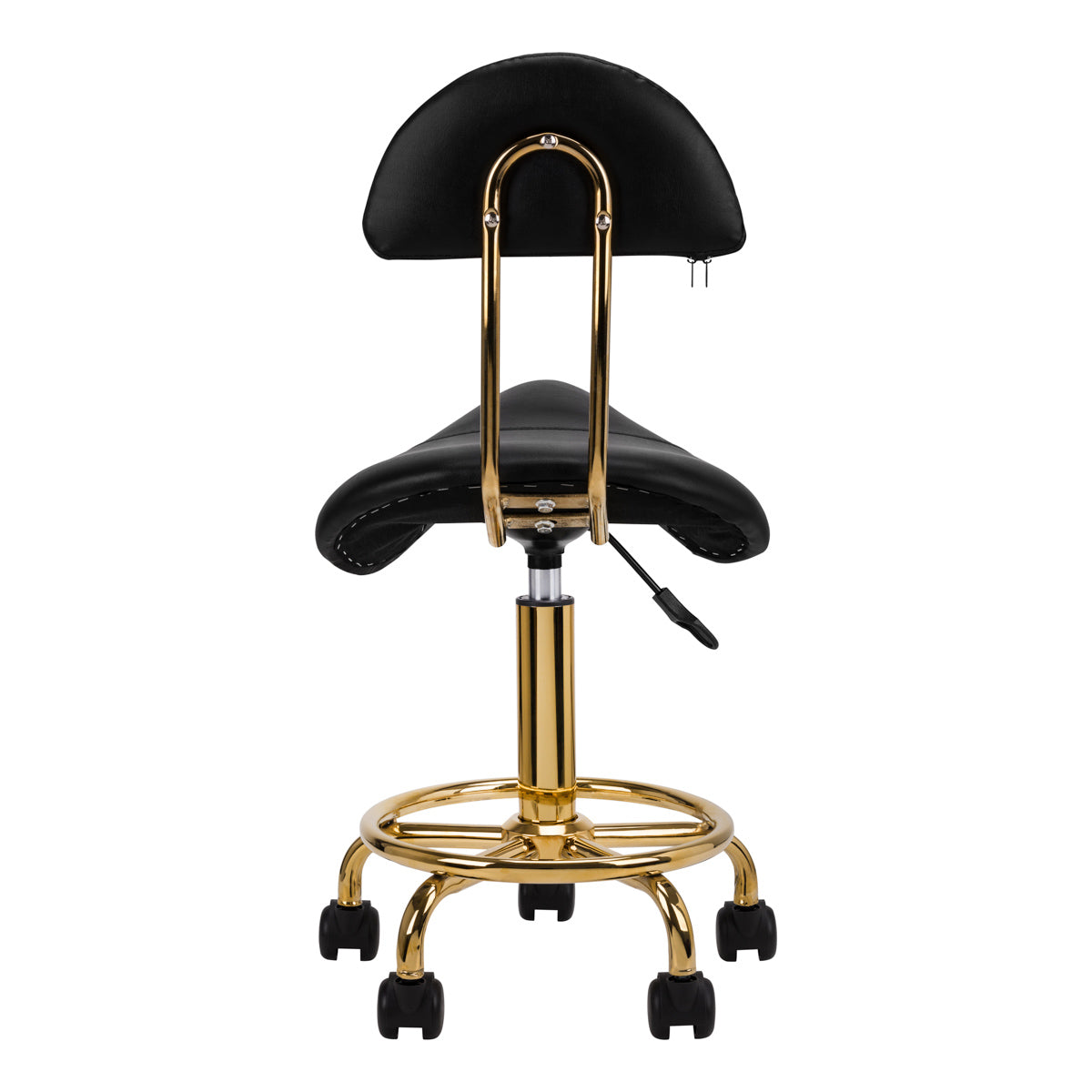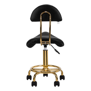 Taburete cosmético cómodo y estable con respaldo, con asiento perfilado y elementos metálicos en color dorado. Sobre una base de cinco radios con ruedas de plástico. Disponible en color negro, mueble imprescindible en el salón de belleza.