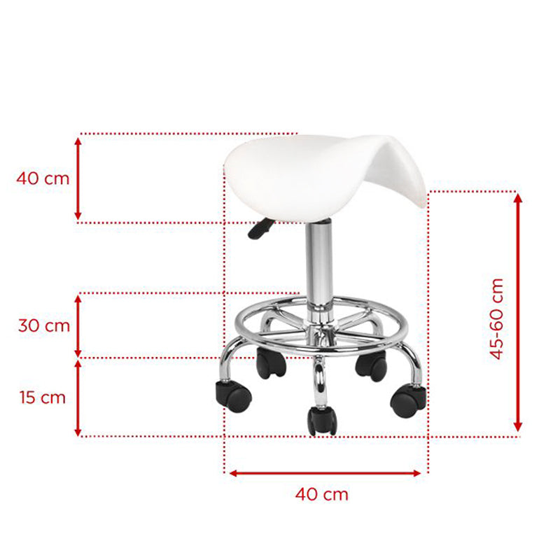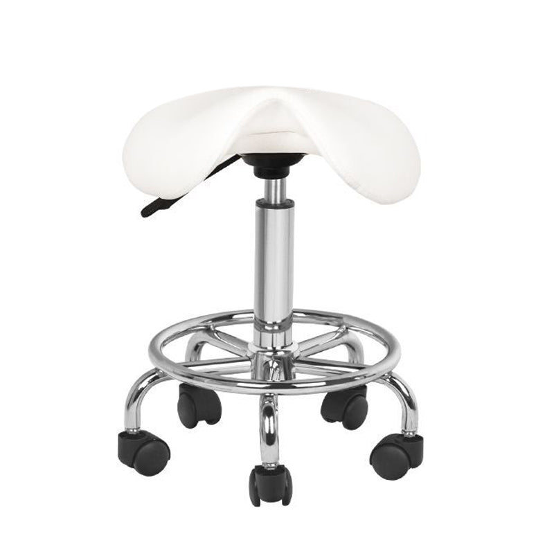 El asiento del taburete ha sido cuidadosamente diseñado en forma de silla de montar , lo que permite una distribución natural del peso corporal. Proporciona comodidad incluso durante largas jornadas de trabajo y cambios frecuentes de posición, eliminando la sensación de dolor o malestar incluso durante tratamientos de larga duración. El asiento está tapizado con piel sintética duradera y fácil de limpiar en tonos blancos, que añadirá elegancia y estilo a cualquier interior.