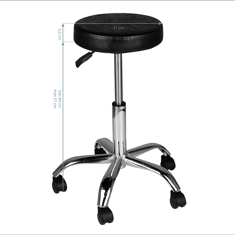 Un taburete cosmético cómodo y estable (AM-310, blanco) sin respaldo tiene una estructura de 5 brazos con ruedas de goma. El taburete cosmético está disponible en blanco. Es un mueble imprescindible en el salón de belleza.