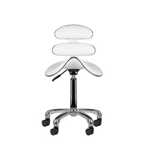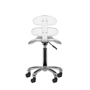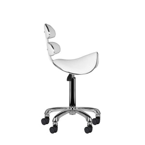 Un taburete cosmético cómodo y estable con un asiento bien formado y un respaldo ergonómico. Tiene un marco muy estable de 5 brazos con excelente goma y ruedas con rodamiento Roll Speed para facilitar el movimiento. Confección en ecopiel en color blanco.