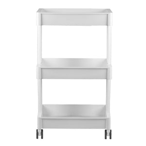 Un carrito cosmético de plástico funcional con ruedas de goma. Dispone de tres estantes con una barrera que evita la caída de accesorios.