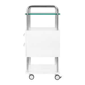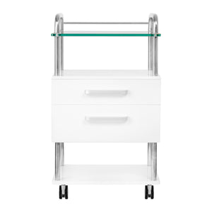 Un auxiliar podológico de alta calidad es un mueble cosmético funcional con ruedas. Gracias a su movilidad, podrás transportarlo a otras salas de tratamiento. El ayudante tiene una encimera de cristal, dos cajones para herramientas, accesorios y un estante para una fresadora de podología u otro dispositivo.