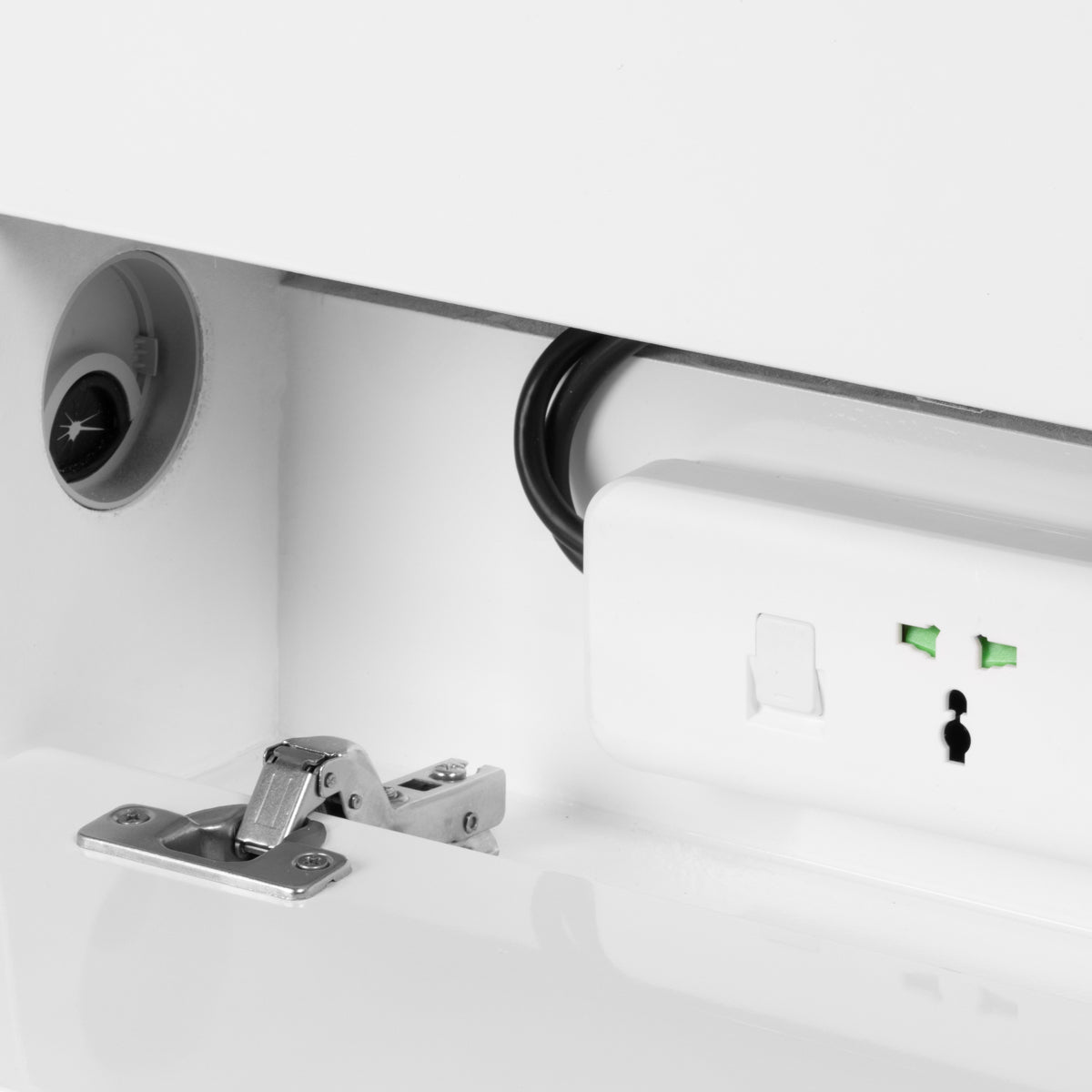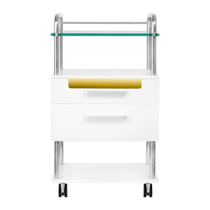 Un auxiliar podológico de alta calidad es un mueble cosmético funcional con ruedas. Gracias a su movilidad, podrás transportarlo a otras salas de tratamiento. El ayudante dispone de una encimera de cristal, cajones para herramientas, accesorios y un estante para una fresadora poliológica u otro dispositivo. Un cajón tiene una lámpara UV-C incorporada para una mejor esterilidad de herramientas y accesorios.