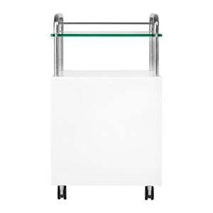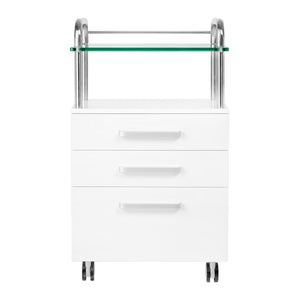 Un auxiliar podológico de alta calidad es un mueble cosmético funcional con ruedas. Gracias a su movilidad, podrás transportarlo a otras salas de tratamiento. El ayudante tiene una encimera de cristal, tres cajones para herramientas, accesorios y un estante para una fresadora poliológica u otro dispositivo.