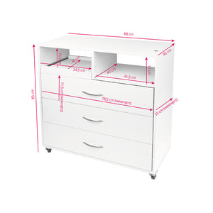 Carro cosmético profesional, sólidamente construido con cajones, con cajón especial para esterilizador UVC y estante para fresador. Dispone de ruedas de metal-goma que facilitan su desplazamiento. Todo se completa con un mango para la lámpara lupa TUBE. Está diseñado para facilitar el trabajo de la persona que realiza el tratamiento.