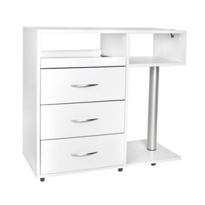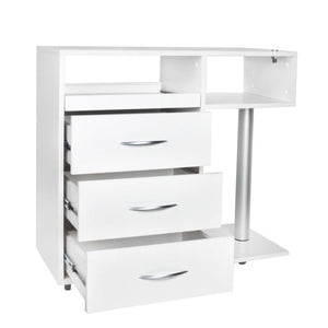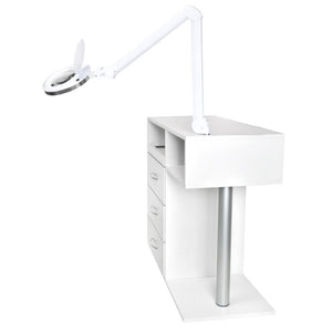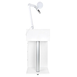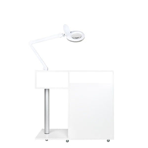 Carro cosmético profesional, sólidamente construido con cajones, con cajón especial para esterilizador UVC y estante para fresador. Dispone de ruedas de metal-goma que facilitan su desplazamiento. Todo se completa con un mango para la lámpara lupa TUBE. Está diseñado para facilitar el trabajo de la persona que realiza el tratamiento.