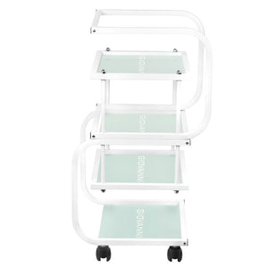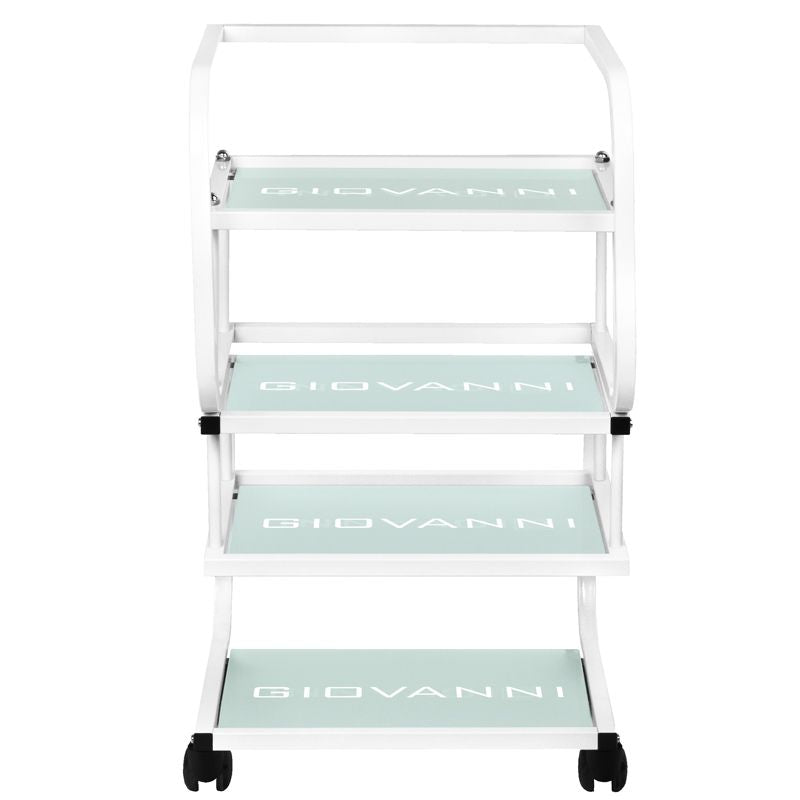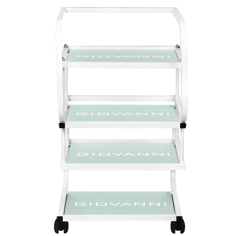 Un estético carrito cosmético de metal y vidrio (1012) para equipos cosméticos. Tiene ruedas. Tiene cuatro compartimentos de cristal grabados con el logo GIOVANNI. Dimensiones: - Dimensiones del carro: 48*44,5*82 - Peso del carro: 12,5 kg - Distancia entre compartimentos: 20,5; 14; 17,5 cm Datos técnicos: - Color: Blanco - Compartimentos de vidrio - Ruedas de goma: 4 piezas - Dimensiones del embalaje: 51,5*45*13 cm - Peso bruto: 15 kg - Cantidad por embalaje: 1