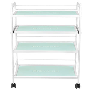 Un carrito cosmético funcional de metal y vidrio con ruedas y estante extraíble. Este mueble robusto es ideal como mesa para utensilios de cosmética. Existe la opción de acoplar una lámpara de aumento y otros elementos. El carrito para cosméticos 1015A tiene cuatro compartimentos de cristal grabados con el logo GIOVANNI. Dimensiones: - Dimensiones del carrito: 70 x 42 x 88 cm - Peso del carrito: 22,5 kg - Distancia entre compartimentos: 10 cm, 18 cm, 26 cm Datos técnicos: - Construcción metálica - Compartimentos de cristal: 4 piezas - Ruedas de goma: 4 piezas - Dimensiones del embalaje : 88 x 43 x 19 - Peso bruto: 25 kg - Cantidad por embalaje: 1