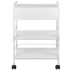 Estético y funcional carrito cosmético de metal y madera GIOVANNI con un cajón de madera con cerradura y dos compartimentos de madera. La parte superior del cajón también sirve como estante. Tiene cuatro ruedas. Está disponible en blanco. Es posible acoplar una lámpara de aumento.