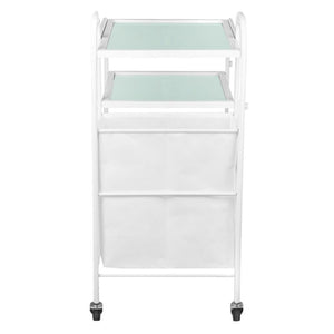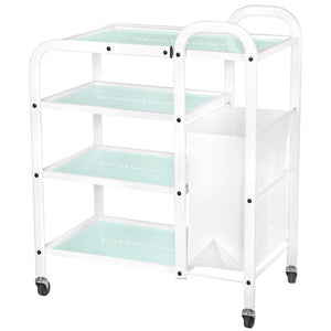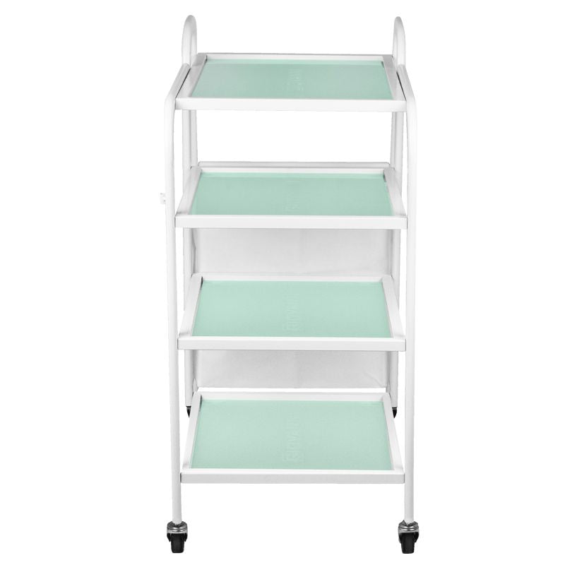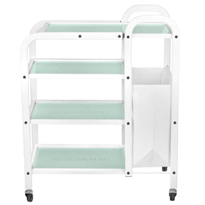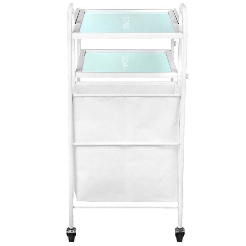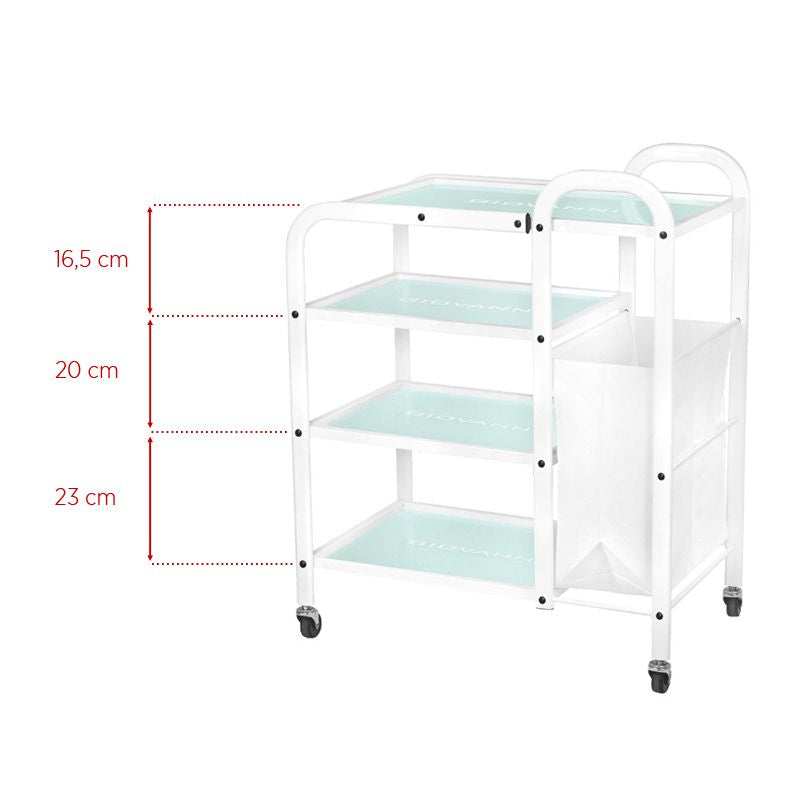 Un carrito cosmético funcional de metal y vidrio con ruedas de goma. Tiene cuatro compartimentos de cristal grabados con el logo GIOVANNI. Otra ventaja de este mueble es la bolsa adjunta para toallas sucias y cinta cosmética.