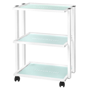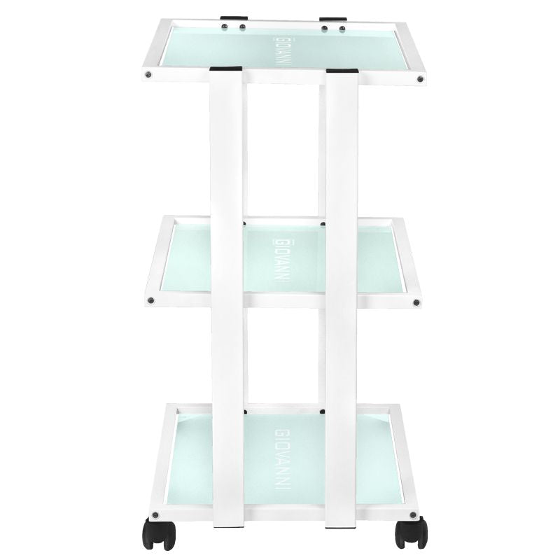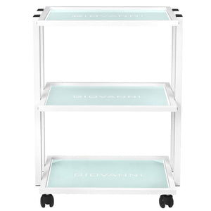 Un robusto carrito para cosméticos de metal y vidrio con ruedas de goma. El modelo GIOVANNI 1041 es ideal como mesa para equipamiento cosmético. Tiene tres compartimentos de cristal grabados con el logo GIOVANNI.