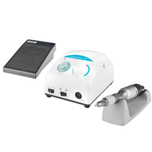 Funciona bien en salones de belleza y podología y es adecuado para trabajos protésicos. El cabezal está diseñado para que su parte superior pueda retirarse y esterilizarse en autoclave. La base de la fresadora es fácil e intuitiva de usar. El botón infinitamente ajustable le permite elegir la intensidad de rotación en el rango de 0 a 40 mil.