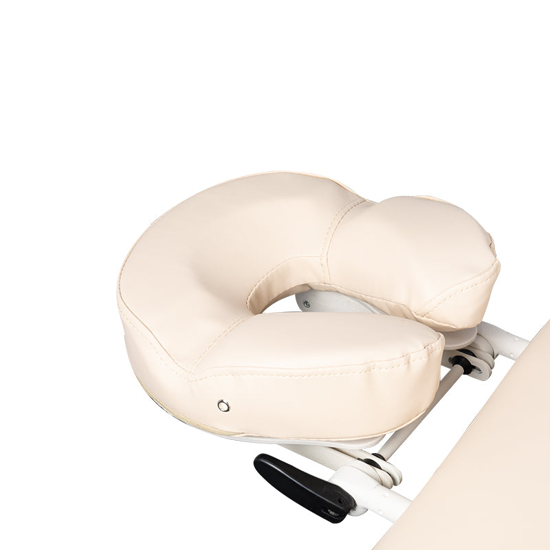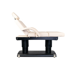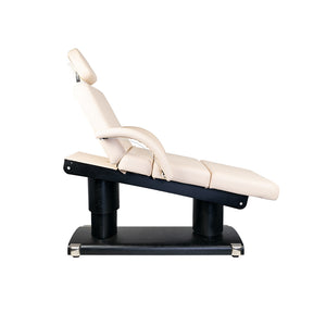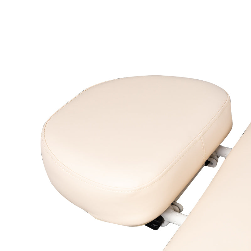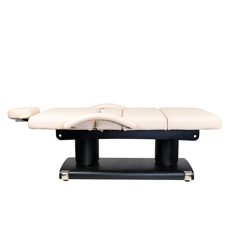 La mesa de cosmética eléctrica tiene una altura ajustable en un rango muy amplio (67-86 cm). El respaldo y los reposapiés también se pueden ajustar mediante el mando a distancia. Hay un recorte facial en el respaldo. Las columnas de soporte se controlan de forma independiente. La tumbona es muy amplia (77 cm) y tiene un colchón calefactable grueso y muy cómodo. La tumbona es muy estable. La tumbona cosmética está tapizada con cuero ecológico de alta calidad en un suave color crudo.