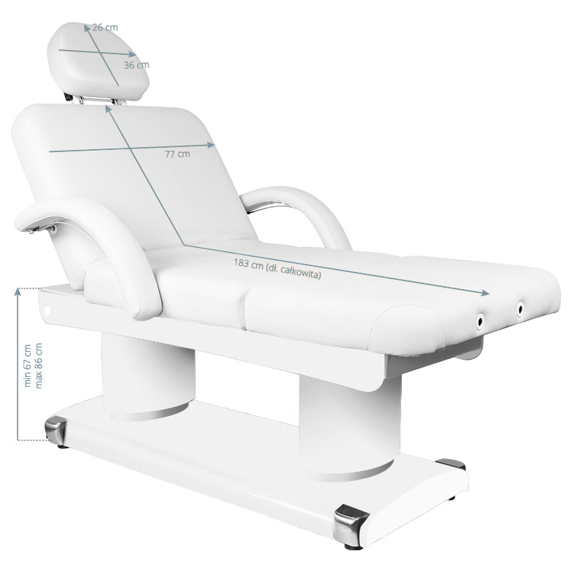 La mesa de cosmética eléctrica tiene una altura ajustable en un rango muy amplio (67-86 cm). El respaldo y los reposapiés también se pueden ajustar mediante el mando a distancia. Hay un recorte facial en el respaldo. Las columnas de soporte se controlan de forma independiente. La tumbona es muy amplia (77 cm) y tiene un colchón calefactable grueso y muy cómodo. La tumbona es muy estable. La tumbona cosmética está tapizada con cuero ecológico de alta calidad en un suave color crudo.