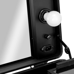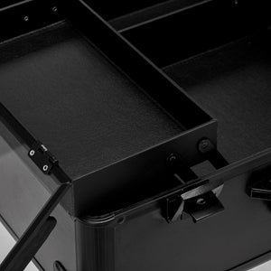 Neceser funcional en forma de cómoda maleta portátil con ruedas. Una solución ideal para esteticistas o maquilladores móviles. Muy espacioso. Dispone de cuatro patas telescópicas, gracias a las cuales podremos regular correctamente la altura de la posición. A los lados hay iluminación del espejo. En el interior del maletero también hay cuatro estantes plegables para pequeños accesorios. Negro.