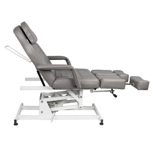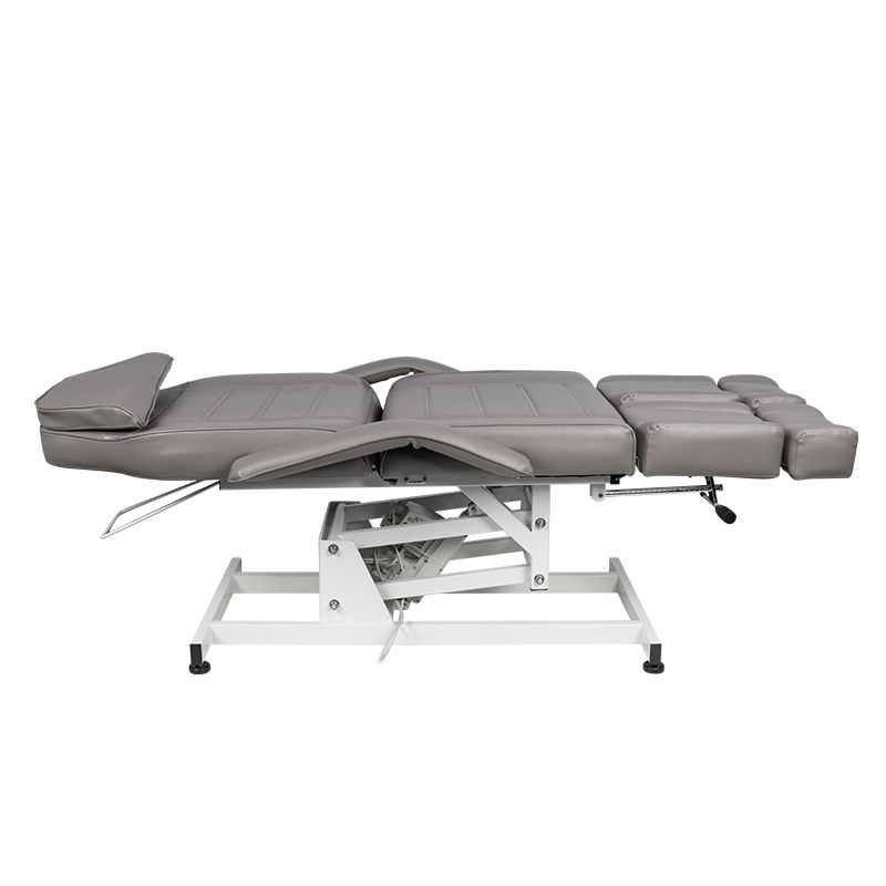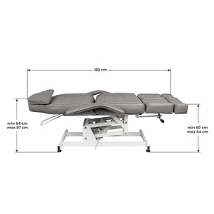 Die Sitzhöhe (oben – unten) der Kosmetikliege kann mit Fernbedienung verstellt werden. Es besteht auch die Möglichkeit, die Neigung der Rückenlehne und Fußstützen zu verstellen. Ein bequemer Kosmetiksessel (bis 180 Grad ausklappbar) kann erfolgreich als Liege verwendet werden. In der Kopfstütze befindet sich ein abdeckbarer Gesichtsausschnitt, der ermöglicht, in einer bequemen Position bei den Behandlungen u. a. bei der Massage zu liegen. Der Sitz ist mit einem hochwertigen und pflegeleichten Ökoleder bedeckt. Es besteht die Möglichkeit, die Armlehnen zu entfernen, was dem Kunden erleichtert, eine Position auf dem Sitz einzunehmen.