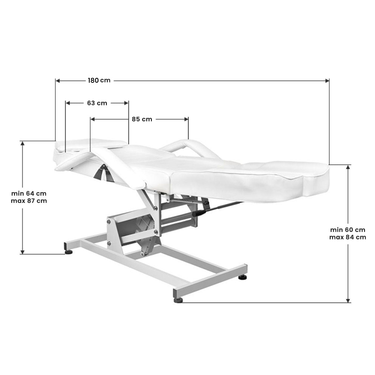 Die Sitzhöhe (oben – unten) der Kosmetikliege kann mit Fernbedienung verstellt werden. Es besteht auch die Möglichkeit, die Neigung der Rückenlehne und Fußstützen zu verstellen. Ein bequemer Kosmetiksessel (bis 180 Grad ausklappbar) kann erfolgreich als Liege verwendet werden. In der Kopfstütze befindet sich ein abdeckbarer Gesichtsausschnitt, der ermöglicht, in einer bequemen Position bei den Behandlungen u. a. bei der Massage zu liegen. Der Sitz ist mit einem hochwertigen und pflegeleichten Ökoleder bedeckt. Es besteht die Möglichkeit, die Armlehnen zu entfernen, was dem Kunden erleichtert, eine Position auf dem Sitz einzunehmen.