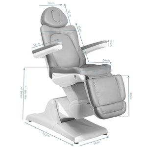 Eine moderne elektrisch verstellbare Kosmetikliege, die für einen Komfort bei der Behandlung nicht nur der Patienten, sondern auch der Personen sorgt, die die Behandlung durchführen. Die leisen Elektromotoren ermöglichen, die Kosmetikliege schnell und bequem einzustellen. Die Kosmetikliege hat einen geformten und sehr bequemen Sitz, ist widerstandsfähig und sehr stabil. Dank aufklappbaren Armlehnen ist es dem Kunden leichter, eine Position auf dem Sitz einzunehmen.
