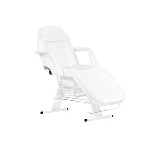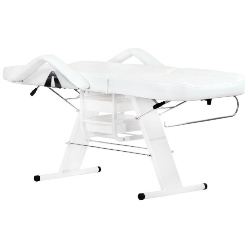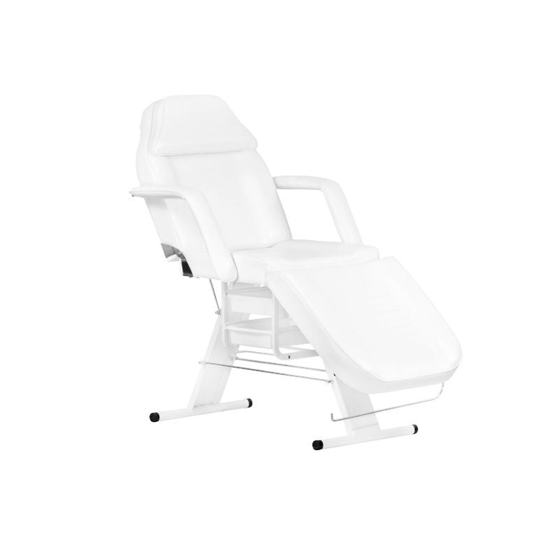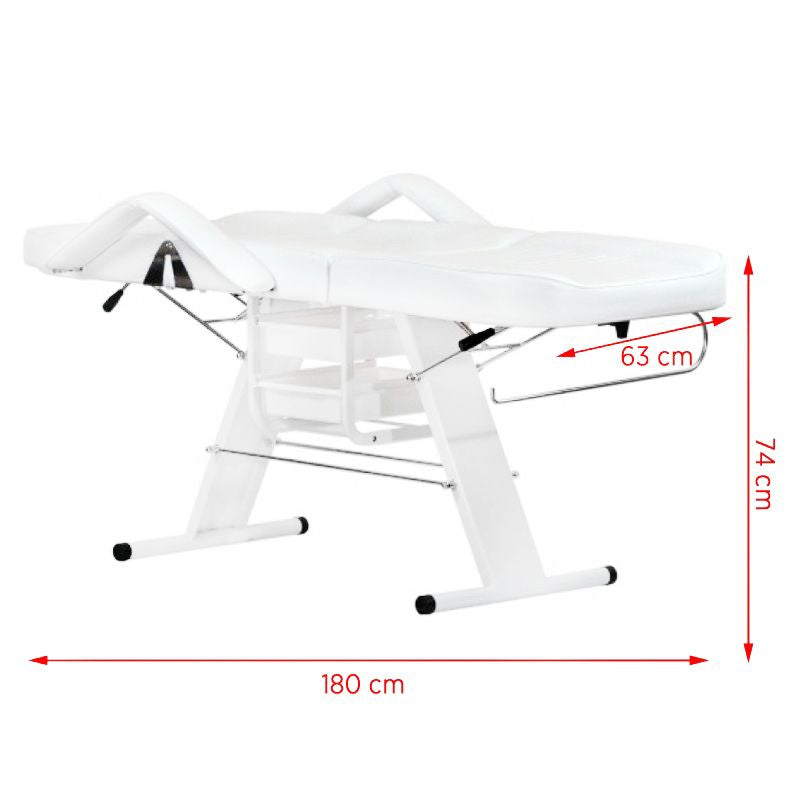 Die Kosmetikliege A-202 mit einem Gesichtsausschnitt in der Kopfstütze und mit praktischen Aufbewahrungsladen. Sie ist ideal für Kosmetik, für vorteilhafte Gestaltung des Gesichts mit Make-up oder für Massage geeignet. Sie verfügt über Armlehnen und über einen Gesichtsausschnitt in der Kopfstütze, der bei Nichtgebrauch abgedeckt werden kann. Die Bespannung der Kosmetikliege ist leicht zu reinigen, aus dem Ökoleder hergestellt, erfüllt die strengen EU-Anforderungen, ist ästhetisch und besitzt vernickelte Metallteile. Unter dem Sitz ist ein Bügel für Einwegbetttuch, Servietten oder Handtuch befestigt. Die Liege ist in Weiß erhältlich. Das Set beinhaltet: - Sitz - Armlehnen: 2 St. - Aufbewahrungsladen 2 St. - Bügel für Bezug - Führungsschienen für Aufbewahrungsladen: 2 St. - Stahlrahmen, die ein solides Kosmetikliegegestell bilden: 2 St. - Anschlagpuffer für Stahlrahmen der Kosmetikliege: 2 St. - Montageanleitung - Garantie Liege-Abmessungen:
